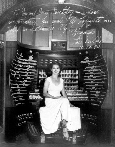 A 1940 photograph of Lois Miller, the Hall Organist for over 30 years. She began in the early 30's when the organ was installed and was last photographed at the console in 1969.