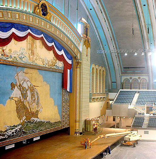 Vibrant new painting and color illuminations highlight the proscenium. The Kiosk for the 7-manual console, Right Stage and Right Forward organ chambers can be seen in the photo.